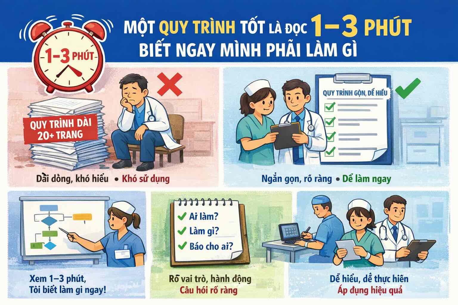 Trong nhiều bệnh viện, “quy trình” thường bị hiểu nhầm là một văn bản để lưu trữ, để đối phó kiểm tra, hoặc để “cho đủ hồ sơ hệ thống”. Hệ quả là không ít quy trình dài hàng chục trang, câu chữ chung chung, khó đọc, khó nhớ – và gần như không ai dùng trong thực hành hàng ngày.
