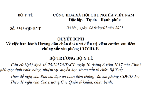 Quyết định 3348/QĐ-BYT năm 2021 hướng dẫn chẩn đoán và điều trị viêm cơ tim sau tiêm chủng vắc xin phòng COVID-19 do Bộ trưởng Bộ Y tế ban hành
