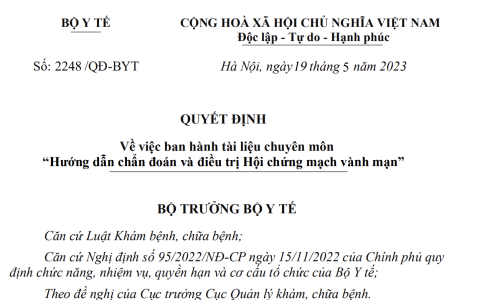 Quyết định 2248/QĐ-BYT ngày 19/05/2023 về tài liệu chuyên môn “Hướng dẫn chẩn đoán và điều trị Hội chứng mạch vành mạn” do Bộ trưởng Bộ Y tế ban hành