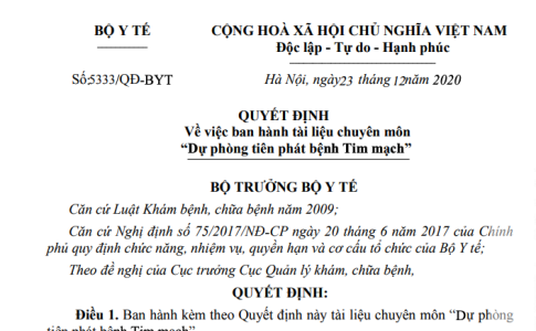 Quyết định 5333/QĐ-BYT ngày 23/12/2020 về tài liệu chuyên môn “Dự phòng tiên phát bệnh Tim mạch” do Bộ trưởng Bộ Y tế ban hành