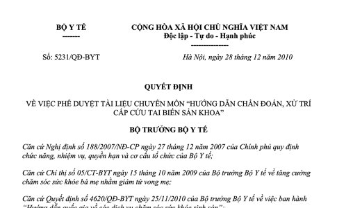 Quyết định 5231/QĐ-BYT ngày 28/12/2010 phê duyệt tài liệu chuyên môn “Hướng dẫn chẩn đoán, xử trí cấp cứu tai biến sản khoa” do Bộ trưởng Bộ Y tế ban hành