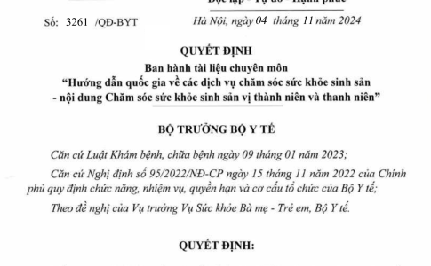 Quyết định 3261/QĐ-BYT ngày 04/11/2024 tài liệu chuyên môn “Hướng dẫn quốc gia về các dịch vụ chăm sóc sức khỏe sinh sản - nội dung Chăm sóc sức khỏe sinh sản vị thành niên và thanh niên” do Bộ trưởng Bộ Y tế ban hành