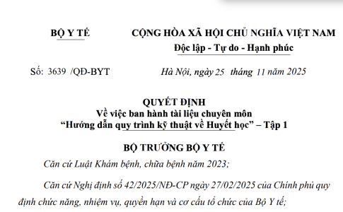 Quyết định 3639/QĐ-BYT năm 2025 về Tài liệu chuyên môn “Hướng dẫn quy trình kỹ thuật về Huyết học” - Tập 1 do Bộ trưởng Bộ Y tế ban hành