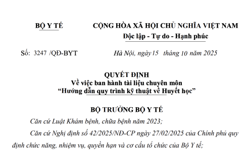 Quyết định 3247/QĐ-BYT năm 2025 về Tài liệu chuyên môn “Hướng dẫn quy trình kỹ thuật về huyết học” do Bộ trưởng Bộ Y tế ban hành