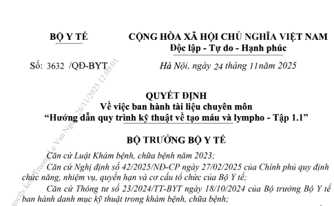Quyết định 3632/QĐ-BYT năm 2025 về Tài liệu chuyên môn “Hướng dẫn quy trình kỹ thuật về tạo máu và lympho - Tập 1.1” do Bộ trưởng Bộ Y tế ban hành