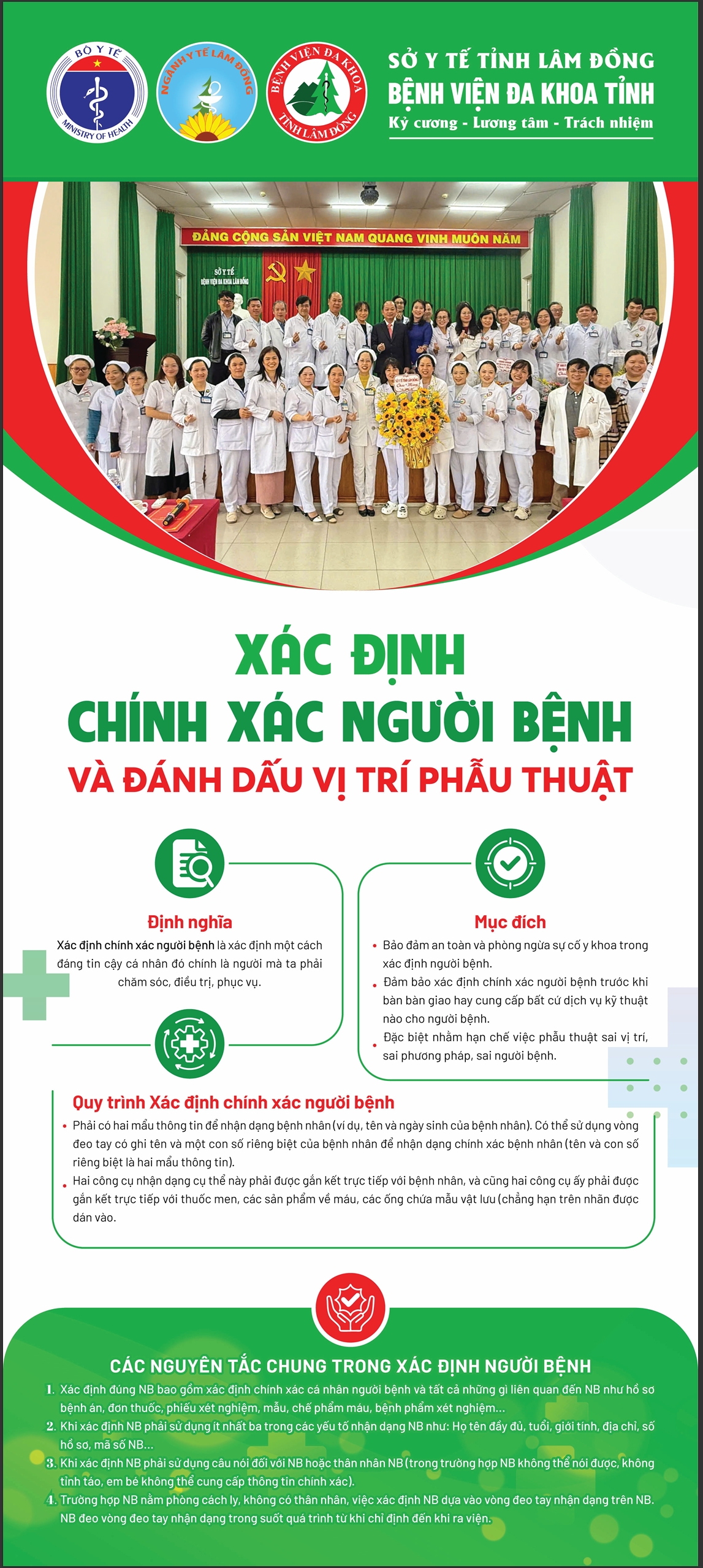 Xác định đúng người bệnh và đánh dấu đúng vị trí phẫu thuật là yêu cầu bắt buộc trong thực hành an toàn người bệnh, giúp phòng ngừa nhầm lẫn trong chăm sóc, điều trị và can thiệp thủ thuật/phẫu thuật. Đây là bước kiểm soát quan trọng nhằm giảm sự cố y khoa, bảo đảm người bệnh được thực hiện đúng dịch vụ, đúng quy trình và đúng thời điểm.