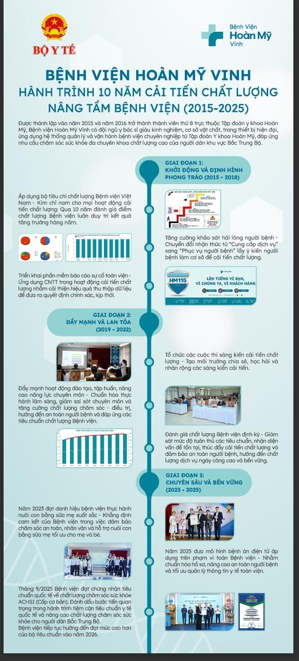 Hành trình 10 năm (2015–2025) của Bệnh viện Hoàn Mỹ Vinh là tiến trình cải tiến liên tục từ nền tảng đến chuyên sâu: chuẩn hóa hệ thống, lan tỏa văn hóa chất lượng, nâng tầm chuyên môn và đẩy mạnh chuyển đổi số. Với chứng nhận ACHSI và định hướng phát triển bền vững, bệnh viện tiếp tục mục tiêu nâng cao an toàn, hiệu quả điều trị và sự hài lòng của người bệnh, đóng góp tích cực cho chất lượng chăm sóc sức khỏe khu vực Bắc Trung Bộ.