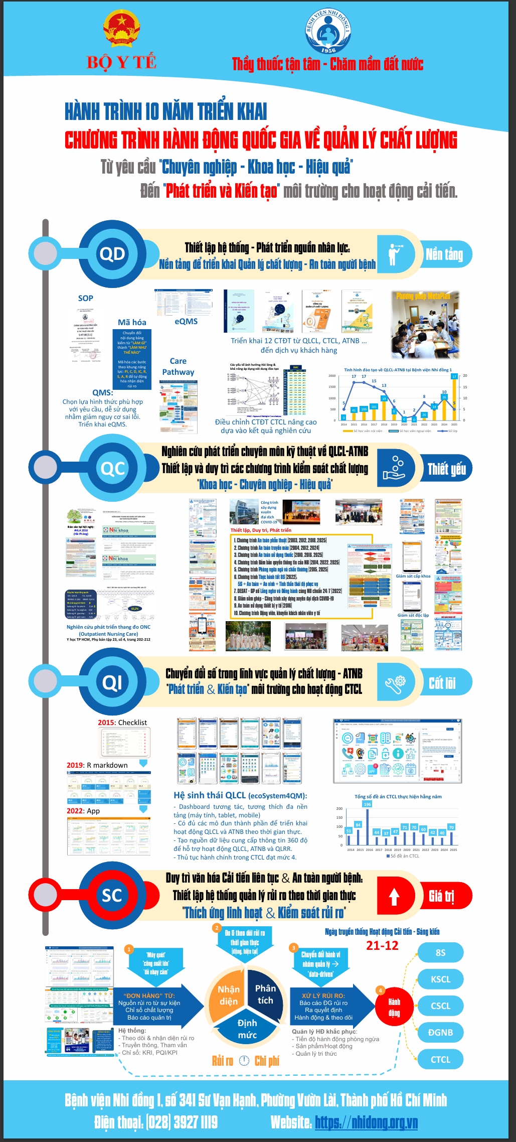 Từ “chuyên nghiệp – khoa học – hiệu quả” đến “phát triển – kiến tạo”, hành trình 10 năm của Bệnh viện Nhi Đồng 1 là minh chứng cho sự kiên định với mục tiêu nâng cao chất lượng, đảm bảo an toàn người bệnh và tăng độ tin cậy hệ thống. Với nền tảng hệ thống, nguồn nhân lực và chuyển đổi số ngày càng hoàn thiện, bệnh viện tiếp tục mở rộng các chương trình cải tiến, quản lý rủi ro và phát triển văn hóa chất lượng để phục vụ người bệnh ngày một tốt hơn.