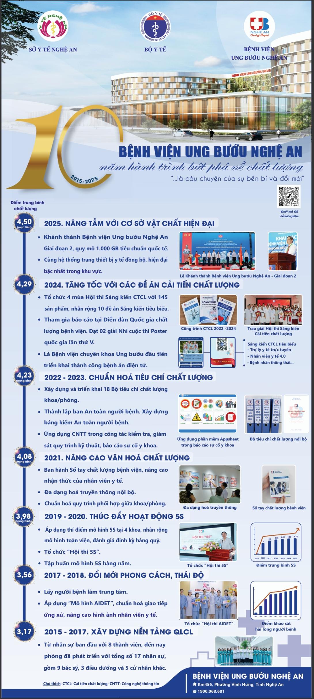 Hành trình 10 năm của Bệnh viện Ung bướu Nghệ An là quá trình bền bỉ xây nền – tăng tốc cải tiến – bứt phá hiện đại hóa, hướng tới hệ thống y tế an toàn, chất lượng và lấy người bệnh làm trung tâm. Với nền tảng quản lý chất lượng ngày càng vững chắc, cùng cơ sở vật chất và công nghệ được đầu tư đồng bộ, bệnh viện tiếp tục khẳng định mục tiêu nâng cao chất lượng khám chữa bệnh, gia tăng sự hài lòng và niềm tin của người bệnh trong giai đoạn phát triển mới.