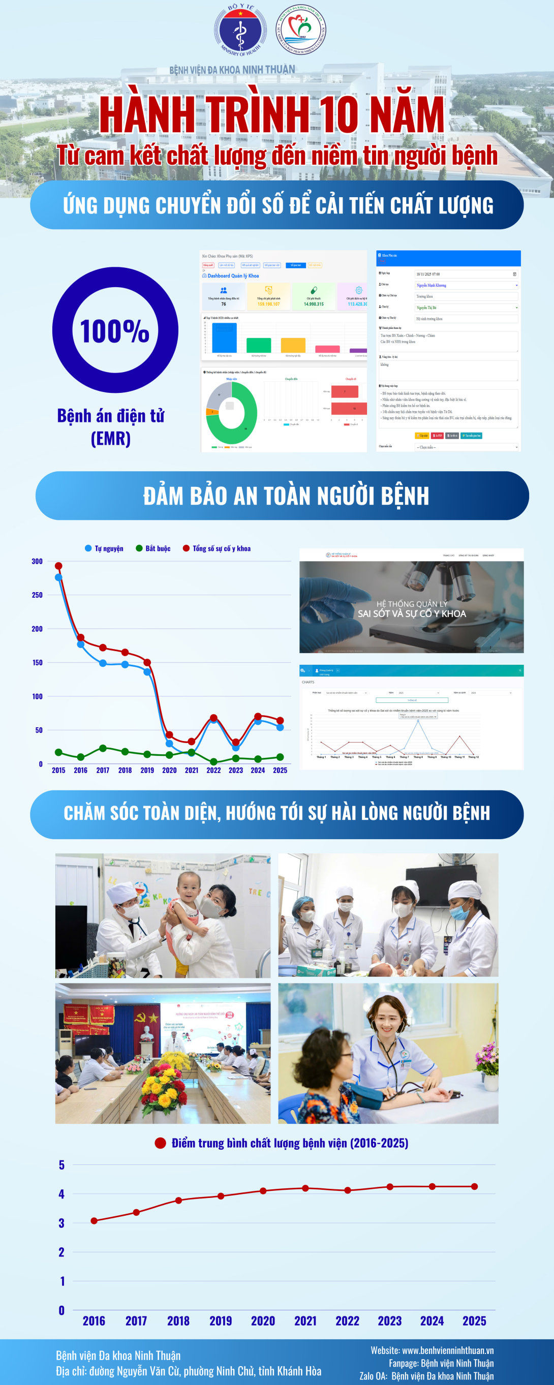 Hành trình 10 năm là minh chứng cho nỗ lực đổi mới của Bệnh viện Đa khoa Ninh Thuận trong việc ứng dụng công nghệ, chuẩn hóa quản trị và củng cố an toàn người bệnh. Bệnh viện tiếp tục duy trì cải tiến liên tục, phát triển bệnh viện thông minh và nâng cao trải nghiệm người bệnh, hướng tới chất lượng ngày càng vững chắc và bền vững.