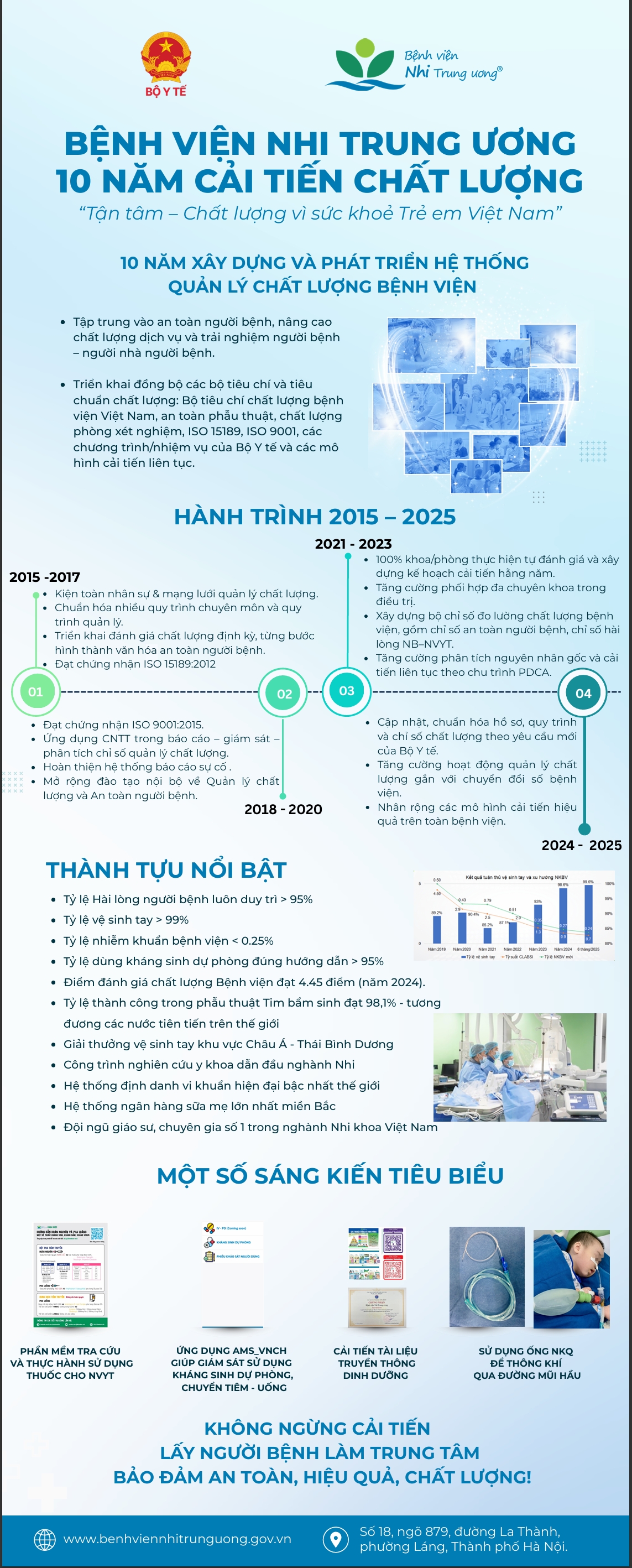 Trong 10 năm qua, Bệnh viện Nhi Trung ương đã xây dựng và phát triển hệ thống quản lý chất lượng toàn diện, hướng đến mục tiêu: an toàn, hiệu quả, chuyên nghiệp và lấy người bệnh làm trung tâm. Trước sự gia tăng nhu cầu chăm sóc sức khỏe nhi khoa và yêu cầu ngày càng khắt khe của xã hội, bệnh viện đã đẩy mạnh triển khai các bộ tiêu chí chất lượng của Bộ Y tế, áp dụng tiêu chuẩn quốc tế, thúc đẩy nghiên cứu khoa học, đổi mới sáng kiến và cải tiến liên tục trong mọi hoạt động.