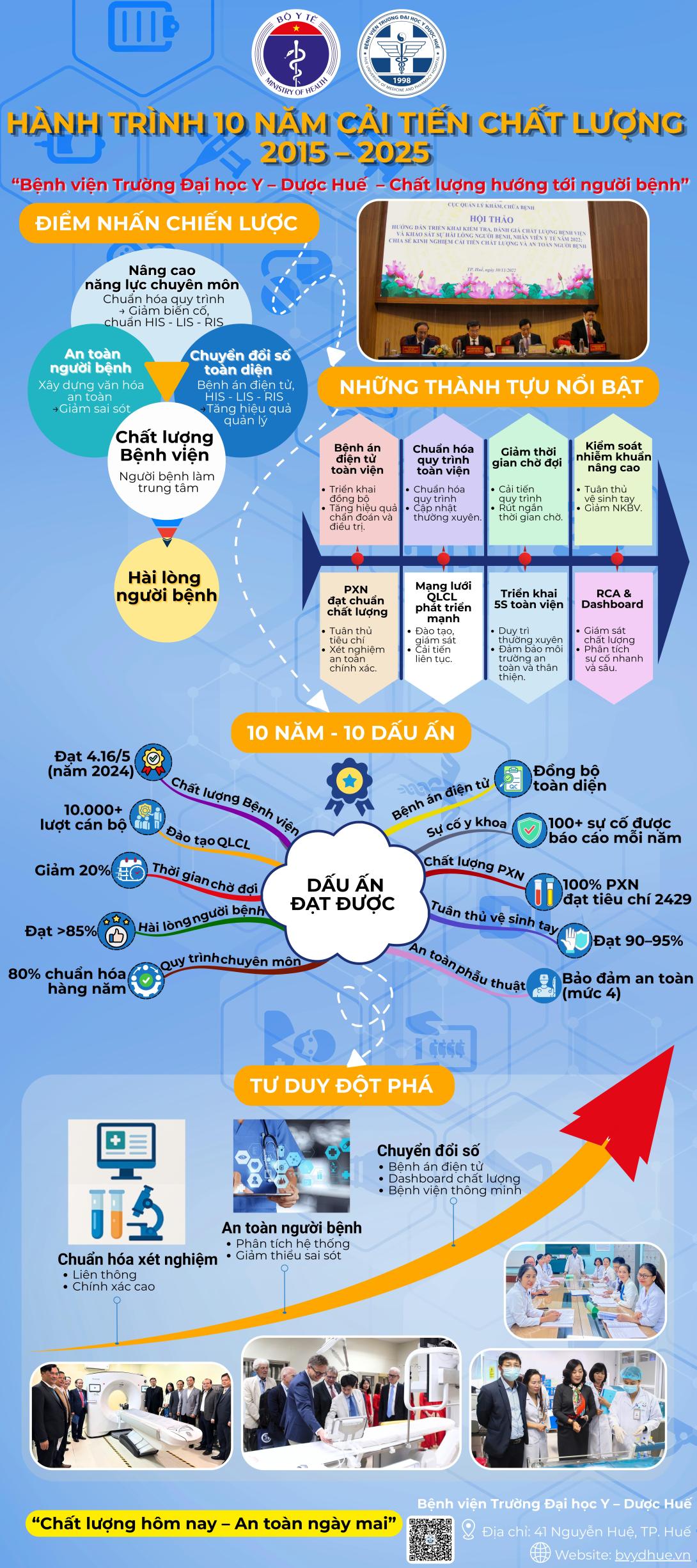 Hành trình 10 năm cải tiến chất lượng của Bệnh viện Trường Đại học Y – Dược Huế phản ánh nỗ lực mạnh mẽ trong chuẩn hóa chuyên môn, tăng cường an toàn người bệnh và ứng dụng chuyển đổi số sâu rộng. Bệnh viện tiếp tục định hướng: