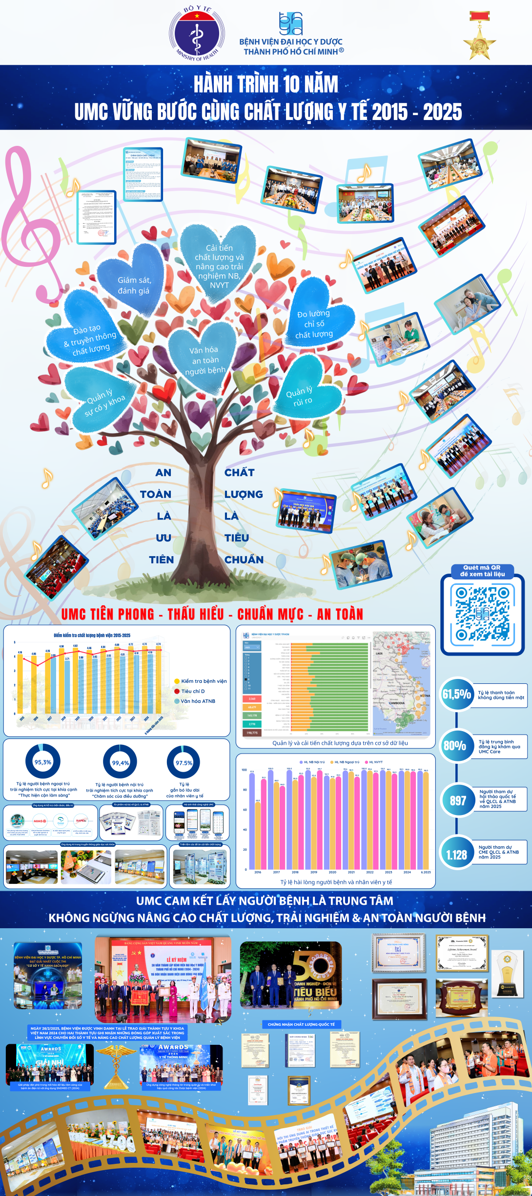 Trong giai đoạn 2015–2025, Bệnh viện Đại học Y Dược TP.HCM (UMC) đã khẳng định vị thế tiên phong trong lĩnh vực quản lý chất lượng và an toàn người bệnh. Với triết lý “Tiên phong – Thấu hiểu – Chuẩn mực – An toàn”, UMC không ngừng đổi mới, cải tiến và phát triển toàn diện, đặt người bệnh làm trung tâm trong mọi hoạt động.