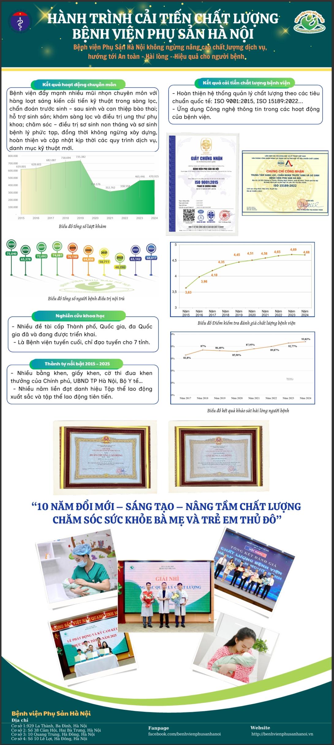 Hành trình 10 năm cải tiến chất lượng của Bệnh viện Phụ Sản Hà Nội thể hiện nỗ lực đồng bộ từ chuyên môn – quản trị chất lượng – công nghệ – nghiên cứu, hướng tới chăm sóc an toàn và lấy người bệnh làm trung tâm. Bệnh viện tiếp tục duy trì cải tiến liên tục, chuẩn hóa hệ thống và nâng cao trải nghiệm người bệnh, vì mục tiêu chăm sóc sức khỏe bà mẹ và trẻ em ngày càng tốt hơn.