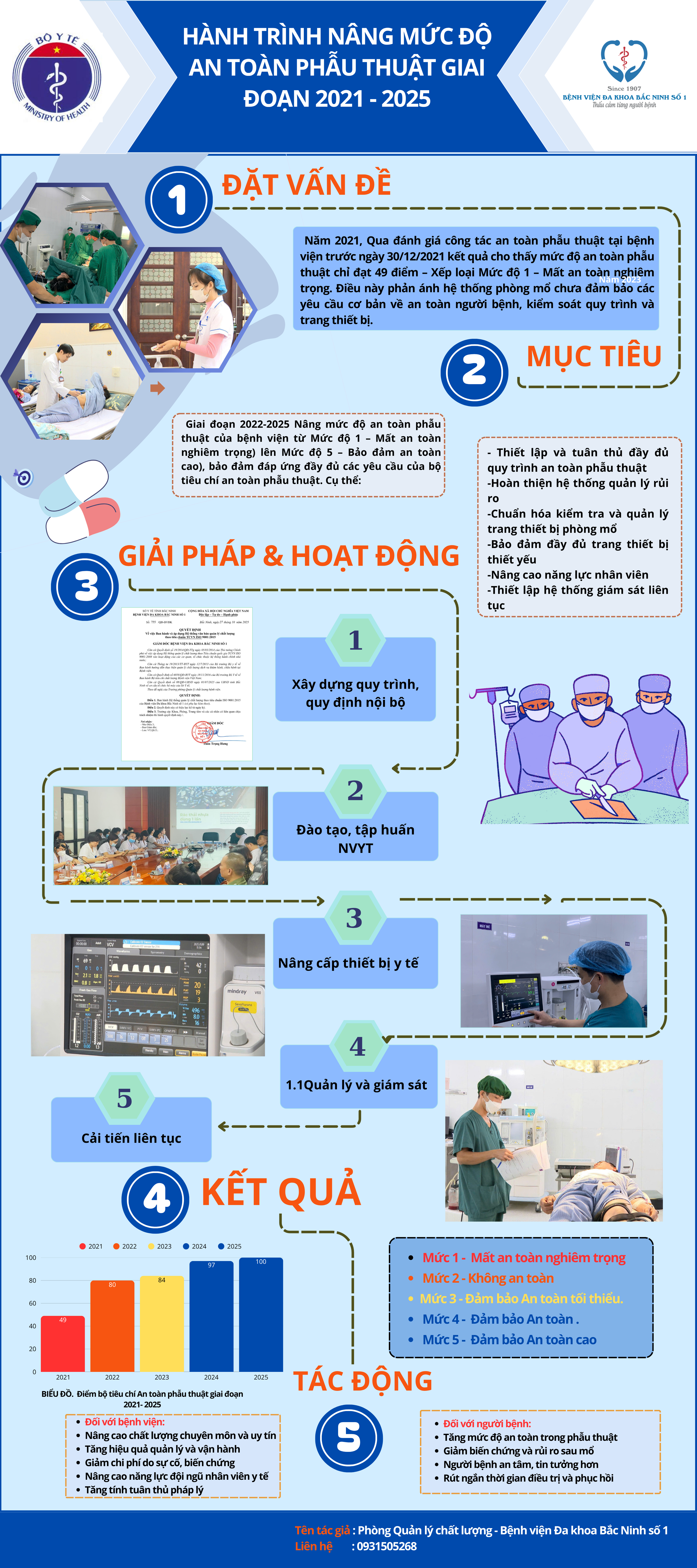 Trước thực trạng đó, bệnh viện xác định giai đoạn 2021–2025 là chặng đường ưu tiên cải thiện mức độ an toàn phẫu thuật, đưa bệnh viện lên Mức độ 5 – Đảm bảo an toàn cao, đáp ứng đầy đủ bộ tiêu chí quốc gia về an toàn phẫu thuật.