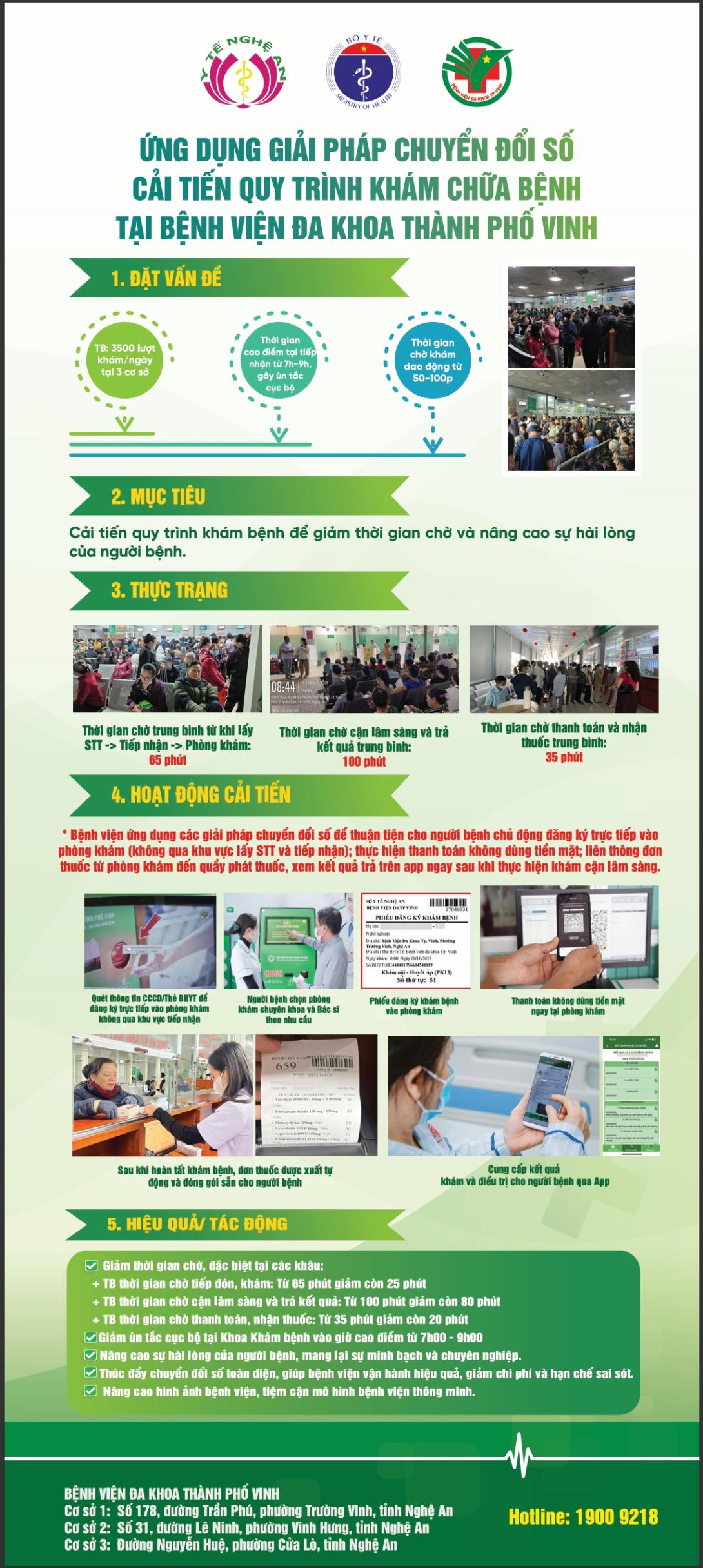 Giải pháp chuyển đổi số trong cải tiến quy trình khám chữa bệnh tại Bệnh viện Đa khoa Thành phố Vinh đã tạo thay đổi rõ rệt về thời gian chờ và hiệu quả vận hành, đặc biệt ở giờ cao điểm. Việc số hóa các điểm chạm (đăng ký – thanh toán – liên thông đơn thuốc – trả kết quả qua app) giúp giảm ùn tắc, nâng cao sự hài lòng người bệnh và là nền tảng để bệnh viện tiếp tục hoàn thiện mô hình khám chữa bệnh hiện đại, thuận tiện và an toàn.