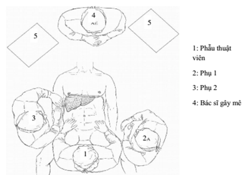 - Kíp mổ: Phẫu thuật viên đứng giữa 2 chân người bệnh, phụ 1 đứng bên trái người bệnh, phụ 2 đứng bên phải người bệnh, màn hình trên đầu bên phải người bệnh.