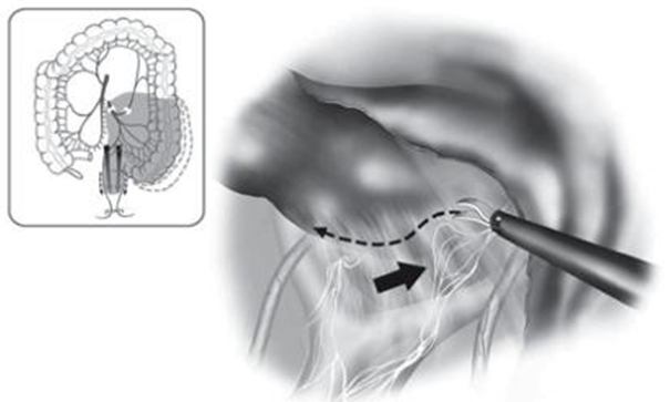 - Mở phúc mạc phần thấp của mạc treo đại tràng sigma: bắt đầu ở u nhô, di dọc the bờ phải của động mạch chủ lên tới dây chằng treitz. Phẫu tích tổ chức mỡ xác định bó mạch mạc treo tràng dưới cặp clips cắt. Chú ý thần kinh giao cảm cạnh động mạch chủ.