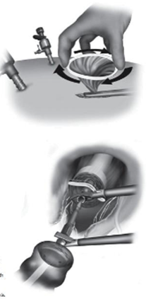 - Tiến hành nối mỏm trực tràng và đại tràng xuống bằng máy nối tròn đưa qua hậu môn. Kiểm tra miệng nối kín bằng cách bơm khí qua hậu môn sau khi đã cặp đầu trên đại tràng bằng grasper