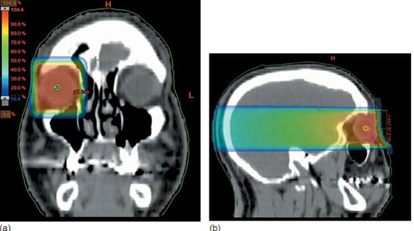 Các chùm tia khi xạ trị giảm nhẹ cho di căn màng mạch có thể xác định được trong mô phỏng. Trường chiếu 4x4 cm đánh dấu trên bề mặt với biên độ trước ở ngoài khóe mắt và tâm trường chiếu ở đồng tử. Trường chiếu chếch về phía sau 5° để tránh hoàn toàn thấu kính ở mắt đối bên. Xem xét phân bố liều lượng theo Dmax hoặc độ sâu của tổn thương di căn trên chẩn đoán hình ảnh.