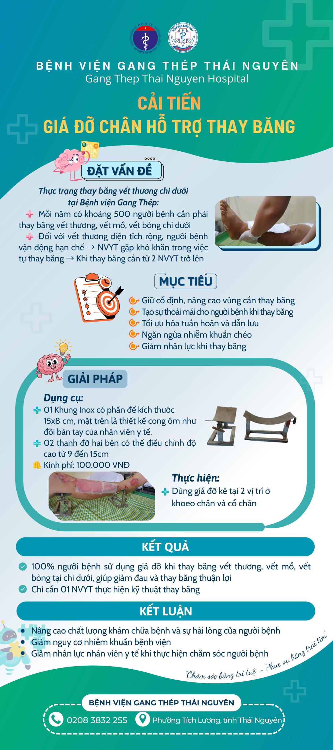 Giá đỡ chân hỗ trợ thay băng là một cải tiến đơn giản, chi phí thấp nhưng mang lại hiệu quả rõ rệt: nâng cao chất lượng chăm sóc, giảm nguy cơ nhiễm khuẩn bệnh viện, đồng thời giảm nhân lực và tăng tính an toàn trong quy trình thay băng vết thương chi dưới. Đây là giải pháp phù hợp để duy trì và nhân rộng trong thực hành chăm sóc người bệnh tại Bệnh viện Gang Thép Thái Nguyên.