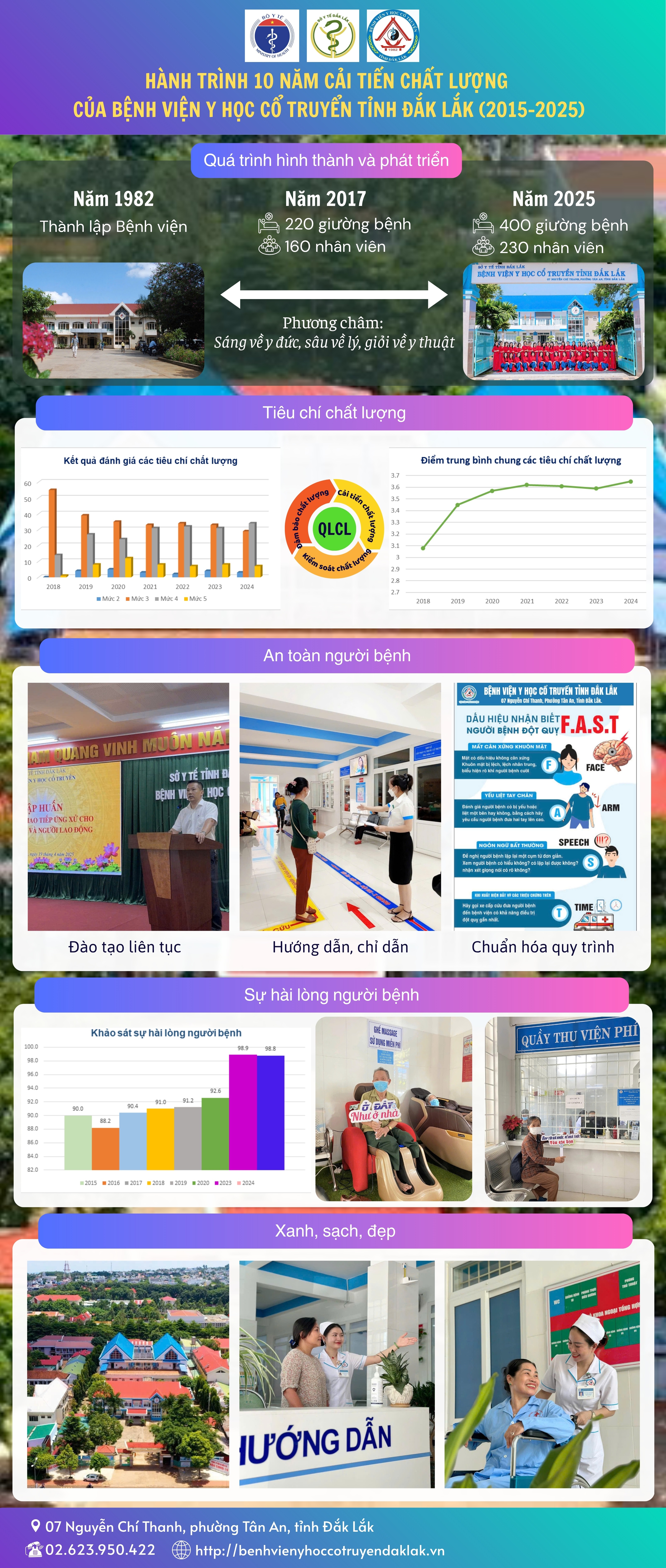 Hành trình 2015–2025 của Bệnh viện Y học Cổ truyền tỉnh Đắk Lắk thể hiện định hướng cải tiến chất lượng toàn diện: vừa nâng cao tiêu chí chất lượng, vừa tăng cường an toàn người bệnh, cải thiện trải nghiệm và sự hài lòng, đồng thời xây dựng môi trường xanh – sạch – đẹp. Đây là nền tảng quan trọng để bệnh viện tiếp tục phát triển bền vững và nâng cao chất lượng dịch vụ y tế trong giai đoạn tiếp theo.
