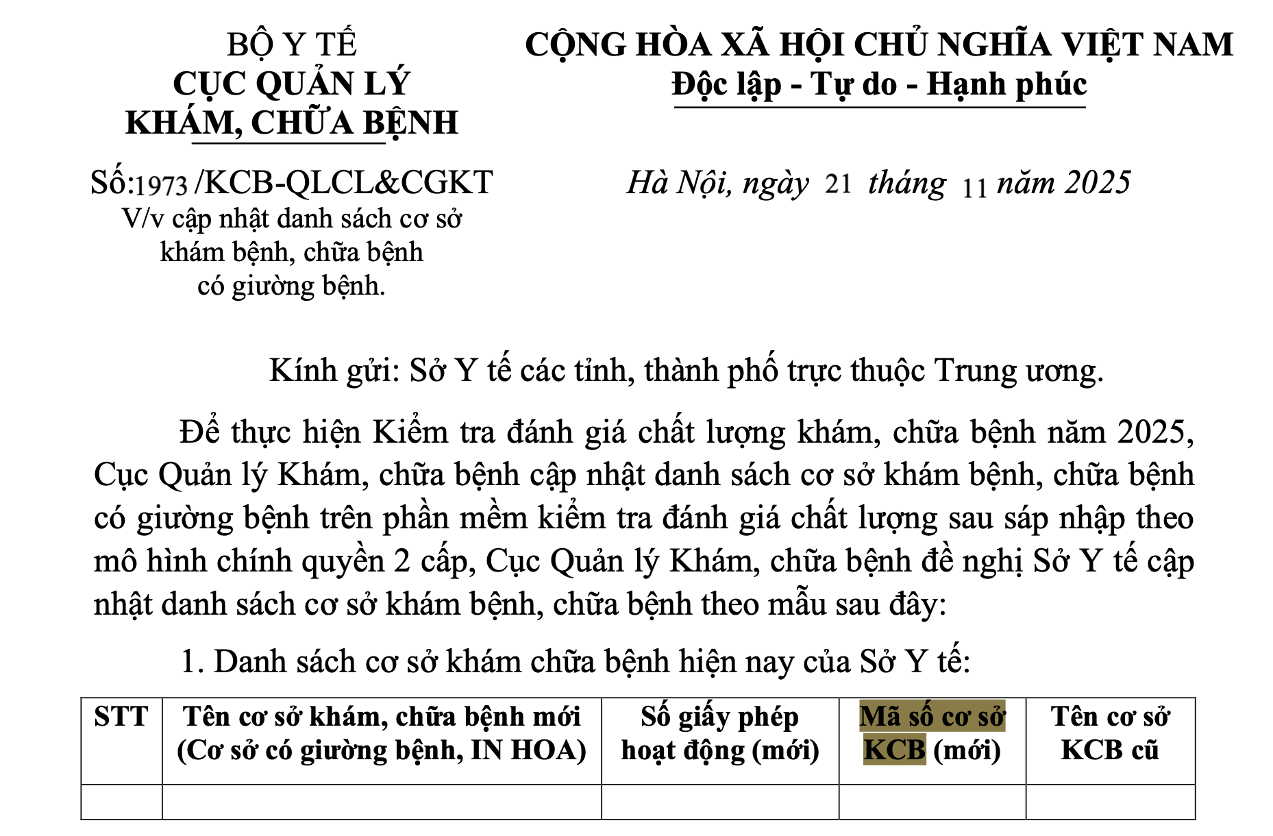 Mã số cơ sở KCB là mã nào trong CV 1973/KCB-QLCL&CGKT V/v cập nhật danh sách cơ sở khám bệnh, chữa bệnh có giường bệnh