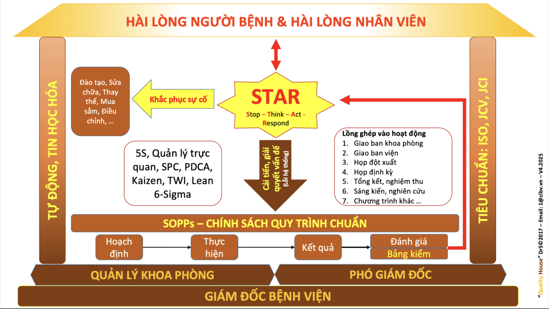 Chiêm nghiệm đó, cảm hứng đó, nhóm đã khởi xướng xây dựng và áp dụng "Ngôi nhà chất lượng - Quality House" trong mọi hoạt động QLCL&ATNB của mình. Rất may mắn khi "Quality House" hội tụ đầy đủ các nguyên tắc của ISO 9001, PDCA, vai trò của lãnh đạo, SOPPs, Kaizen Teian, ... Chuyên gia viện năng suất cũng đã xem và góp ý để phù hợp với các kiến thức, các nguyên tắc GỐC của quản trị, của quản lý chất lượng. Chuyên gia bên y tế cũng đã góp ý về tính khả thi và phù hợp. Đặc biệt có ý kiến từ một người Thầy của tôi - Một trong các chuyên gia về QLCL&ATNB hàng đầu của Việt Nam.