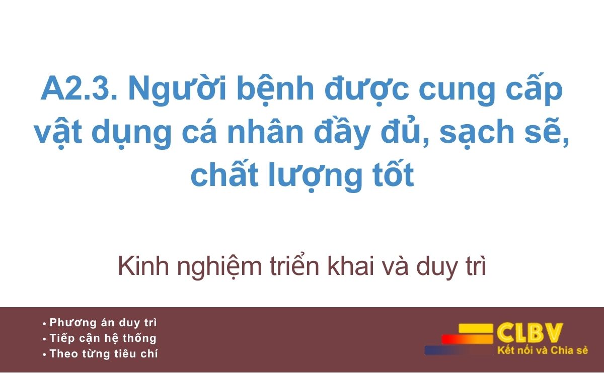 Khi người bệnh phải tự xoay xở chăn màn, quần áo trong điều kiện bệnh tật, chất lượng chăm sóc nội trú đã bị suy giảm ngay từ những điều rất cơ bản. A2.3 vì vậy là tiêu chí thể hiện rõ tính nhân văn và mức độ chuẩn hóa chăm sóc nội trú.
