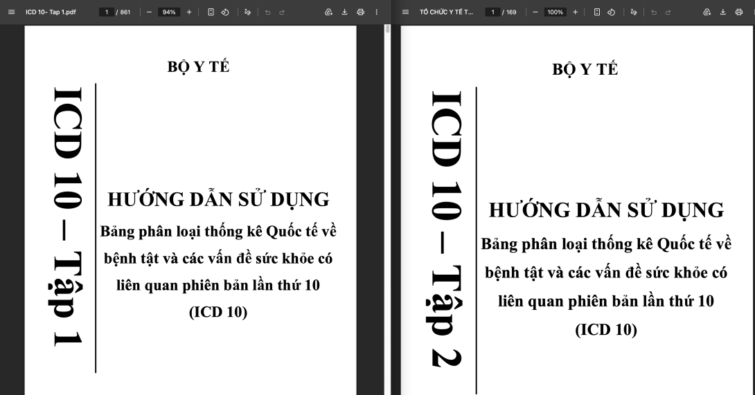 Sách ICD-10 Tập 1 (PDF) là tài liệu "Bảng phân loại thống kê Quốc tế về bệnh tật và các vấn đề sức khỏe có liên quan" do Bộ Y tế Việt Nam ban hành. Tài liệu này cung cấp danh mục chi tiết các chương, nhóm bệnh (Chương I-XXII), hướng dẫn sử dụng và mã hóa bệnh tật (từ A00 đến Z99) phục vụ công tác quản lý và thống kê y tế.
