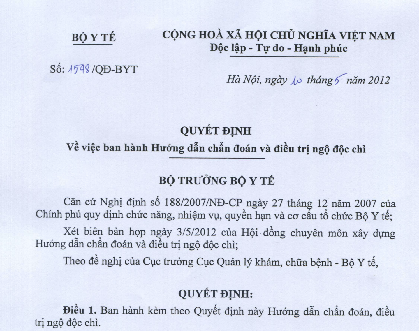 Số: 1548/QĐ-BYT | Hà Nội, ngày 10 tháng 5 năm 2012 |