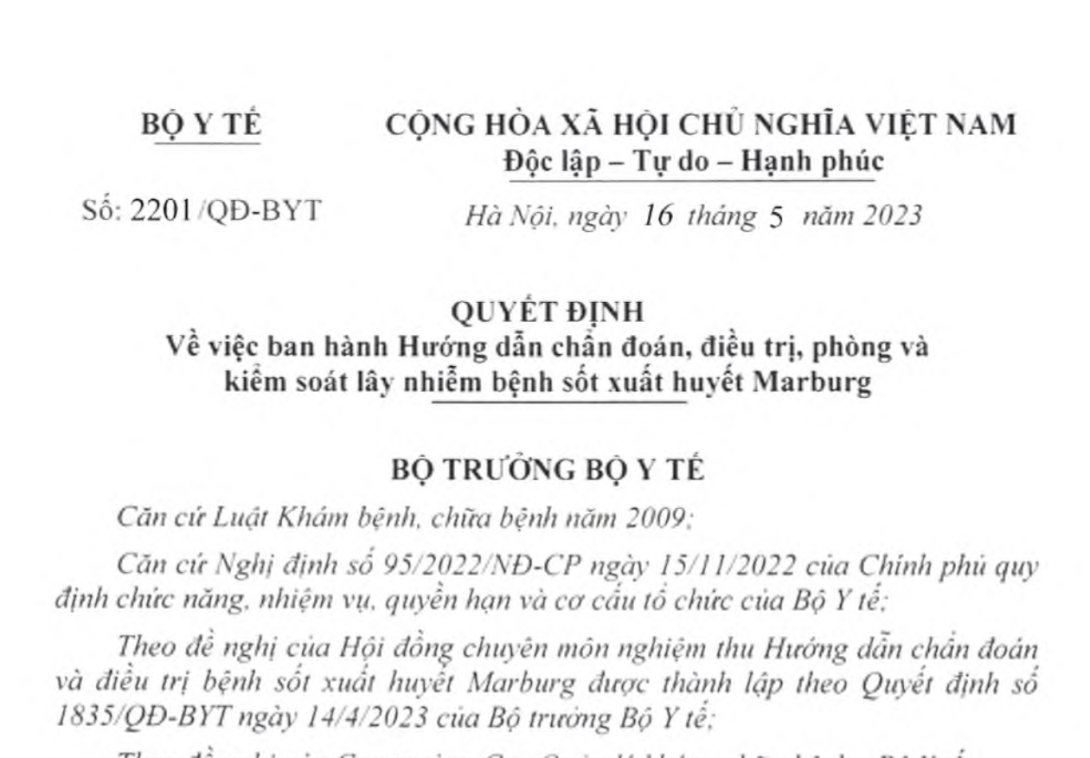 Theo đề nghị của Hội đồng chuyên môn nghiệm thu Hướng dẫn chẩn đoán và điều trị bệnh sốt xuất huyết Marburg được thành lập theo Quyết định số 1835/QĐ-BYT ngày 14/4/2023 của Bộ trưởng Bộ Y tế;