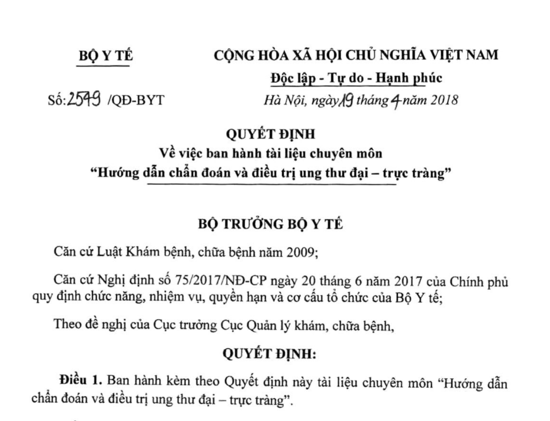VỀ VIỆC BAN HÀNH TÀI LIỆU CHUYÊN MÔN “HƯỚNG DẪN CHẨN ĐOÁN VÀ ĐIỀU TRỊ UNG THƯ ĐẠI - TRỰC TRÀNG”