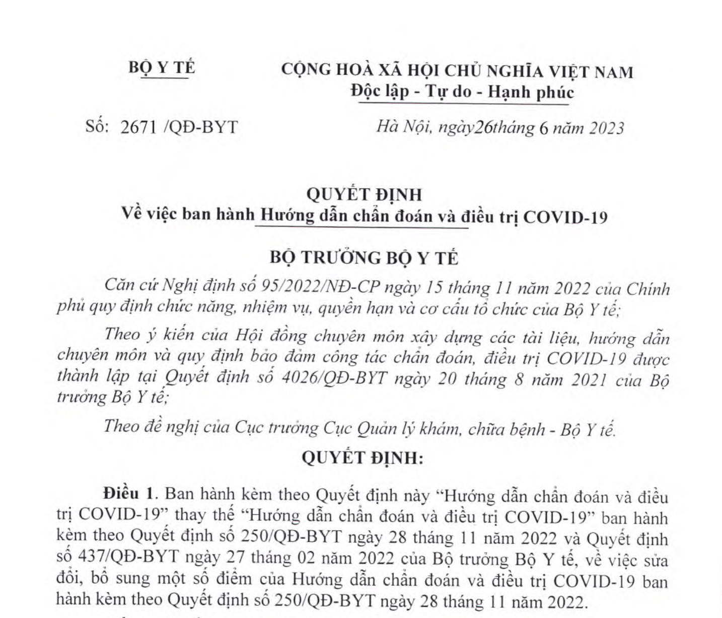 Điều 1. Ban hành kèm theo Quyết định này “Hướng dẫn chẩn đoán và điều trị COVID-19” thay thế “Hướng dẫn chẩn đoán và điều trị COVID-19” ban hành kèm theo Quyết định số 250/QĐ-BYT ngày 28 tháng 11 năm 2022 và Quyết định số 437/QĐ-BYTngày 27 tháng 02 năm 2022 của Bộ trưởng Bộ Y tế, về việc sửa đổi, bổ sung một số điểm của Hướng dẫn chẩn đoán và điều trị COVID-19 ban hành kèm theo Quyết định số 250/QĐ-BYTngày 28 tháng 11 năm 2022.