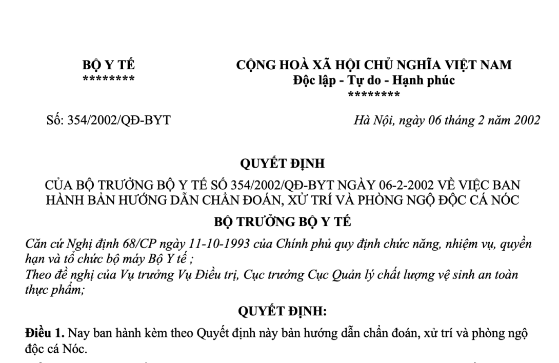 CỦA BỘ TRƯỞNG BỘ Y TẾ SỐ 354/2002/QĐ-BYT NGÀY 06-2-2002 VỀ VIỆC BAN HÀNH BẢN HƯỚNG DẪN CHẨN ĐOÁN, XỬ TRÍ VÀ PHÒNG NGỘ ĐỘC CÁ NÓC