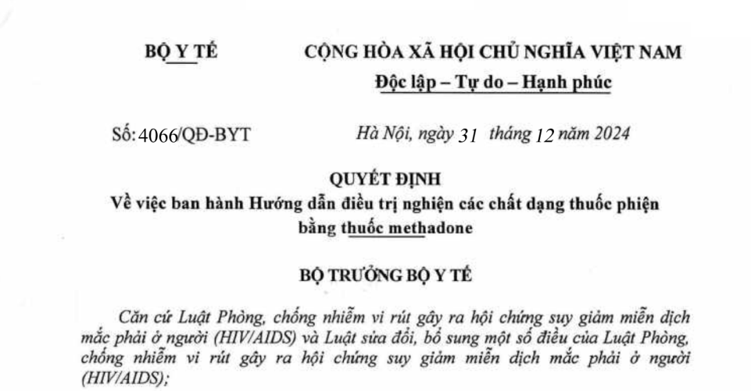 Quyết định 4066/QĐ-BYT năm 2024 về Hướng dẫn điều trị nghiện các chất dạng thuốc phiện bằng thuốc methadone do Bộ trưởng Bộ Y tế ban hành