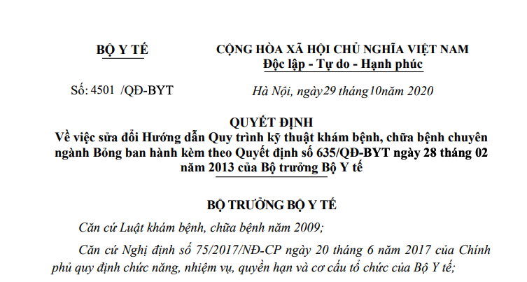 VỀ VIỆC SỬA ĐỔI HƯỚNG DẪN QUY TRÌNH KỸ THUẬT KHÁM BỆNH, CHỮA BỆNH CHUYÊN NGÀNH BỎNG BAN HÀNH KÈM THEO QUYẾT ĐỊNH SỐ 635/QĐ-BYT NGÀY 28 THÁNG 02 NĂM 2013 CỦA BỘ TRƯỞNG BỘ Y TẾ