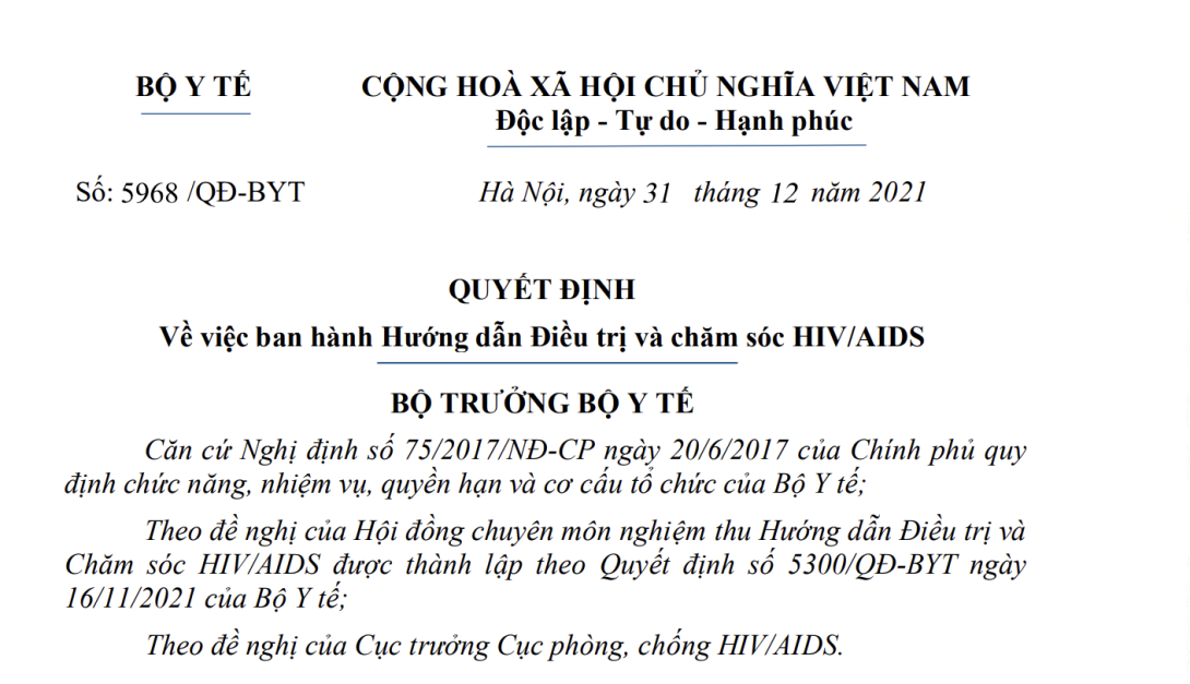 Theo đề nghị của Hội đồng chuyên môn nghiệm thu Hướng dẫn Điều trị và Chăm sóc HIV/AIDS được thành lập theo Quyết định số 5300/QĐ-BYT ngày 16/11/2021 của Bộ Y tế;