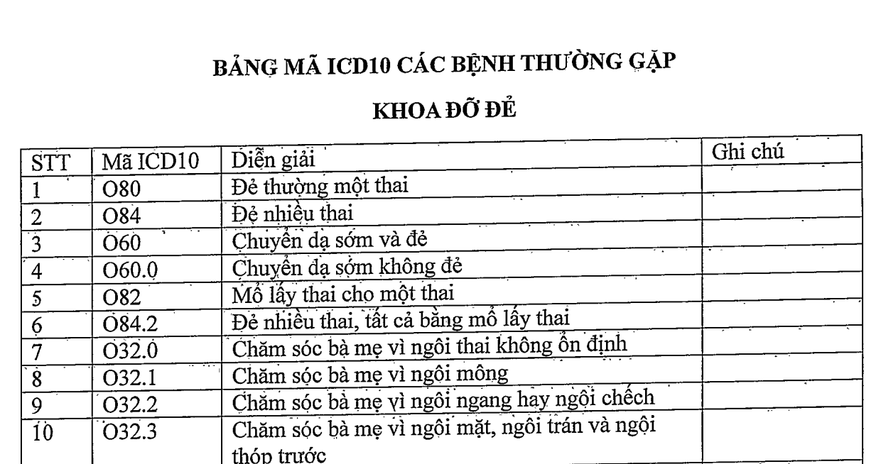 TM11. Sẵn có bảng mã ICD10 cho các bệnh thường gặp của các khoa lâm sàng tại phòng hành chính của khoa.