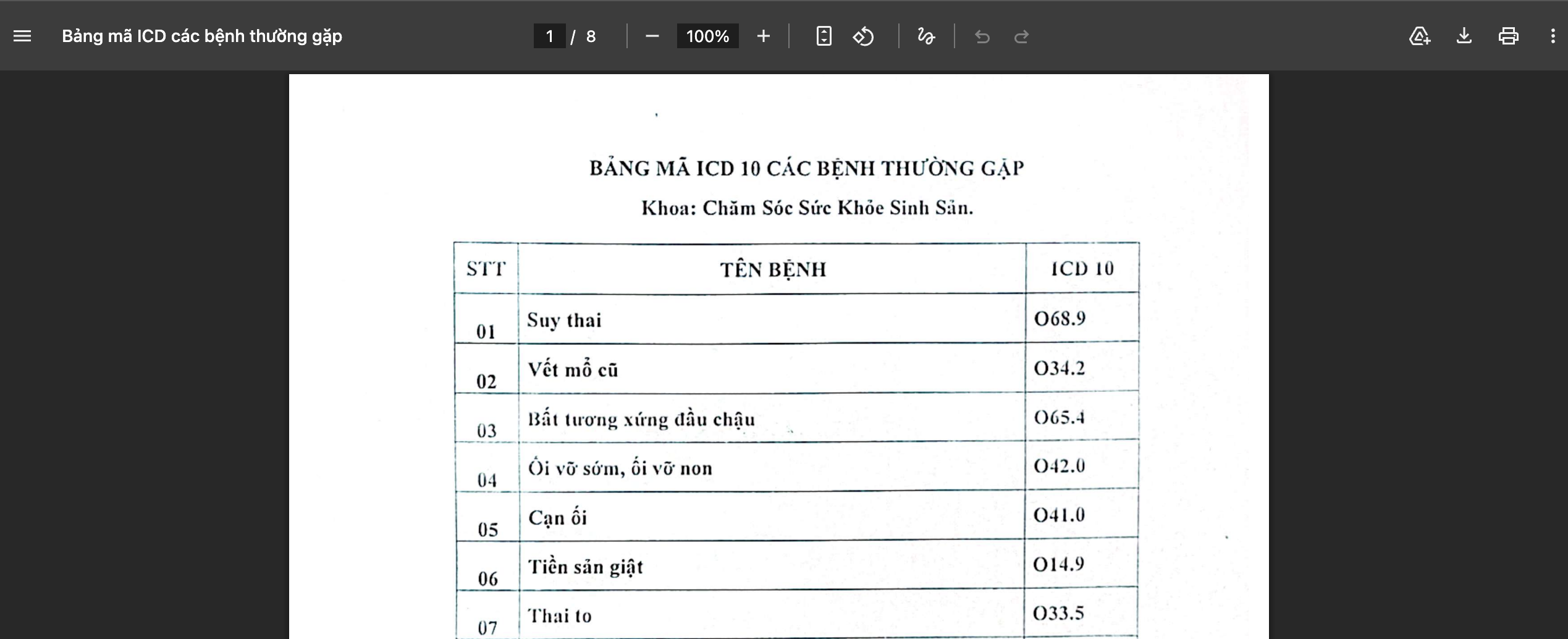 TM10. Sẵn có “Bảng phân loại thống kê quốc tế về bệnh tật và vấn đề sức khỏe có liên quan” phiên bản lần thứ 10 (ICD 10) phòng kế hoạch (hoặc nghiệp vụ).