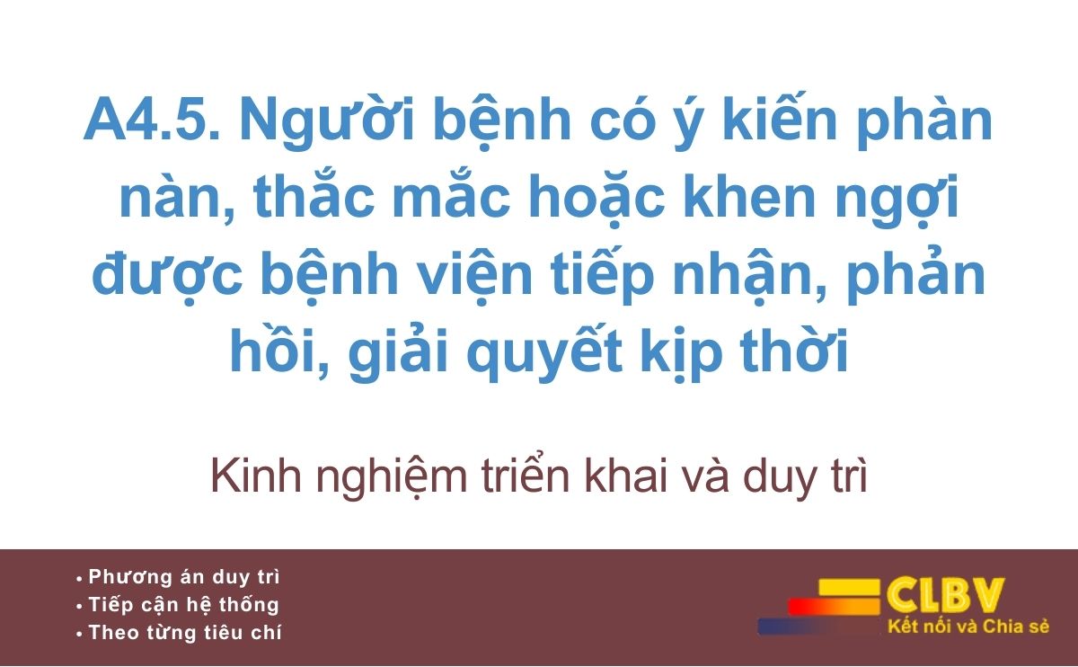 A4.5. Người bệnh có ý kiến phàn nàn, thắc mắc hoặc khen ngợi được bệnh viện tiếp nhận, phản hồi, giải quyết kịp thời