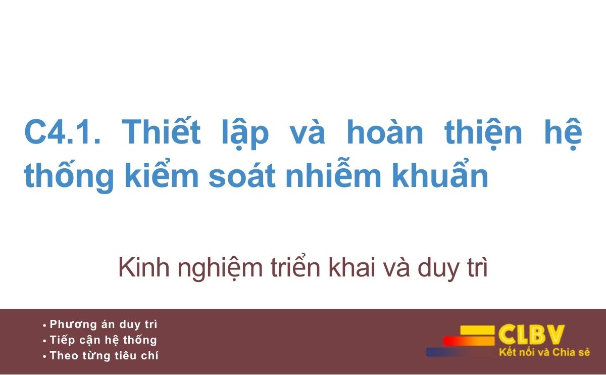 Về bản chất, C4.1 là tiêu chí nền tảng của toàn bộ Chương C4. Nếu hệ thống kiểm soát nhiễm khuẩn không được thiết lập đúng ngay từ đầu, thì các nội dung như vệ sinh tay, xử lý chất thải, khử khuẩn – tiệt khuẩn hay giám sát nhiễm khuẩn bệnh viện sẽ chỉ tồn tại rời rạc, mang tính phong trào hoặc đối phó khi có đoàn kiểm tra.