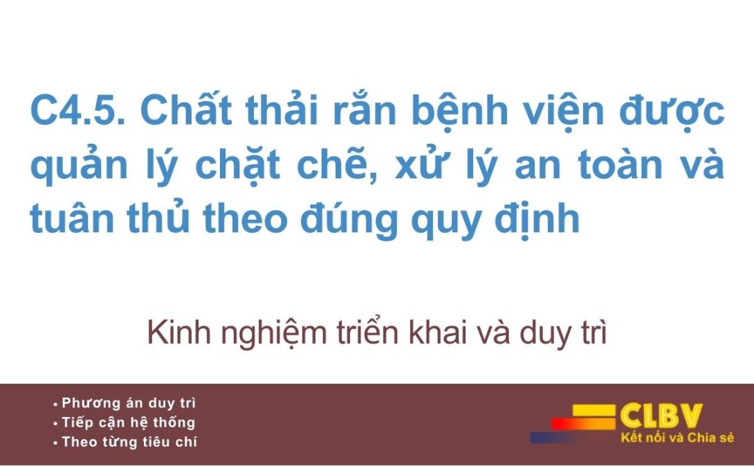 Chất thải rắn y tế là nguồn nguy cơ cao đối với người bệnh, nhân viên y tế và cộng đồng nếu không được quản lý đúng cách. Tuy nhiên, tiêu chí C4.5 không chỉ đánh giá việc “có thu gom rác hay không”, mà đánh giá việc bệnh viện:
