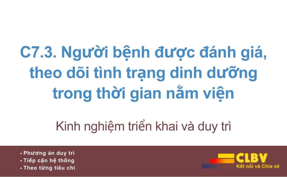 Tiêu chí C7.3 không yêu cầu bệnh viện phải áp dụng các công cụ đánh giá dinh dưỡng phức tạp hay chuyên sâu ngay từ đầu, mà yêu cầu bảo đảm người bệnh được đánh giá và theo dõi tình trạng dinh dưỡng một cách có hệ thống trong suốt thời gian điều trị nội trú.