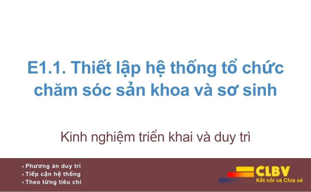 Tiêu chí E1.1 không yêu cầu bệnh viện phải có đầy đủ mọi mô hình sản – nhi hiện đại hay kỹ thuật cao, mà yêu cầu thiết lập được một hệ thống tổ chức chăm sóc sản khoa và sơ sinh có cấu trúc rõ ràng, có phân công trách nhiệm cụ thể và có khả năng phối hợp hiệu quả trong thực hành lâm sàng.