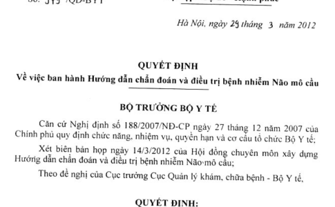 Quyết định 975/QĐ-BYT ngày 29/03/2012 hướng dẫn chẩn đoán và điều trị bệnh nhiễm Não mô cầu do Bộ trưởng Bộ Y tế ban hành