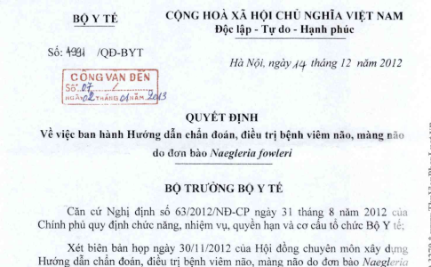 Quyết định 4991/QĐ-BYT ngày 14/12/2012 hướng dẫn chẩn đoán điều trị bệnh viêm não, màng não do đơn bào Naegleria fowleri do Bộ trưởng Bộ Y tế ban hành