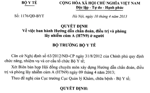 Quyết định 1176/QĐ-BYT ngày 10/04/2013 hướng dẫn chẩn đoán, điều trị và phòng lây nhiễm cúm A (H7N9) ở người do Bộ trưởng Bộ Y tế ban hành