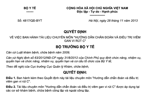 Quyết định 4817/QĐ-BYT ngày 28/11/2013 tài liệu chuyên môn "Hướng dẫn chẩn đoán và điều trị viêm gan vi rút C" do Bộ trưởng Bộ Y tế ban hành