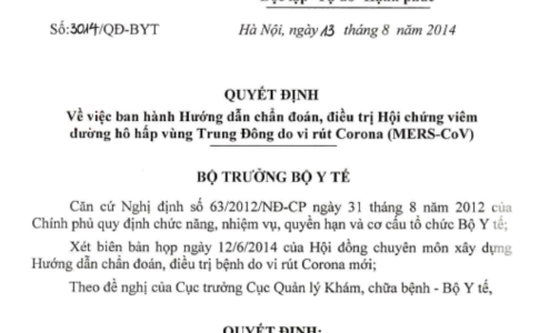 Quyết định 3014/QĐ-BYT ngày 13/08/2014 hướng dẫn chẩn đoán, điều trị Hội chứng viêm đường hô hấp vùng Trung Đông (Mers-CoV) do Bộ trưởng Bộ Y tế ban hành